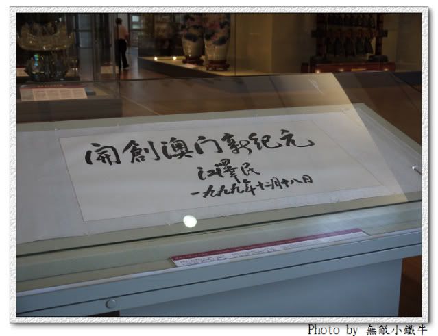 澳門是在 1999 年 12 月 20 號回歸的, 一進館就看到江澤民的墨寶