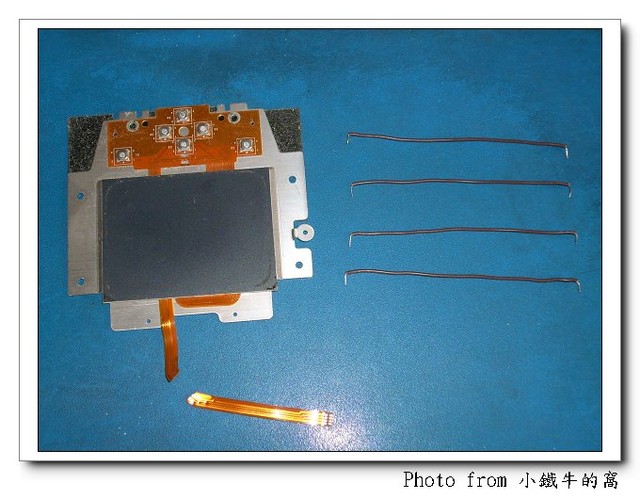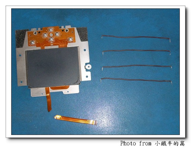 其實我後來再仔細檢視了一下觸控板的內部, 排線外面那兩條應該是接地線及電源線, 而中間較細的兩條一條連到方向鍵, 一條是其它的訊號線, 連同其它訊號線, 最後接到內部的電路板共有 10 條, 裡面有焊點可以接, 不過線距非常細, 差不多 1mm.